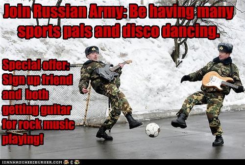 Join Russian Army: Be having many sports pals and disco dancing. Special offer: Sign up friend and both getting guitar for rock music playing!