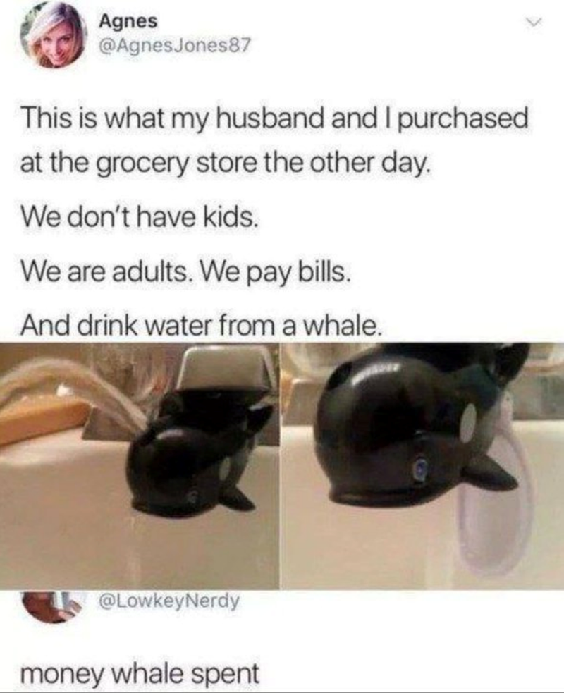 Now that we're an adult and we have adult money, we too, often find ourselves making ridiculous purchases that have no purpose other than to pawsitively bring us joy. If you want to spend money on a whale faucet, you do it. If it makes you smile, why not?