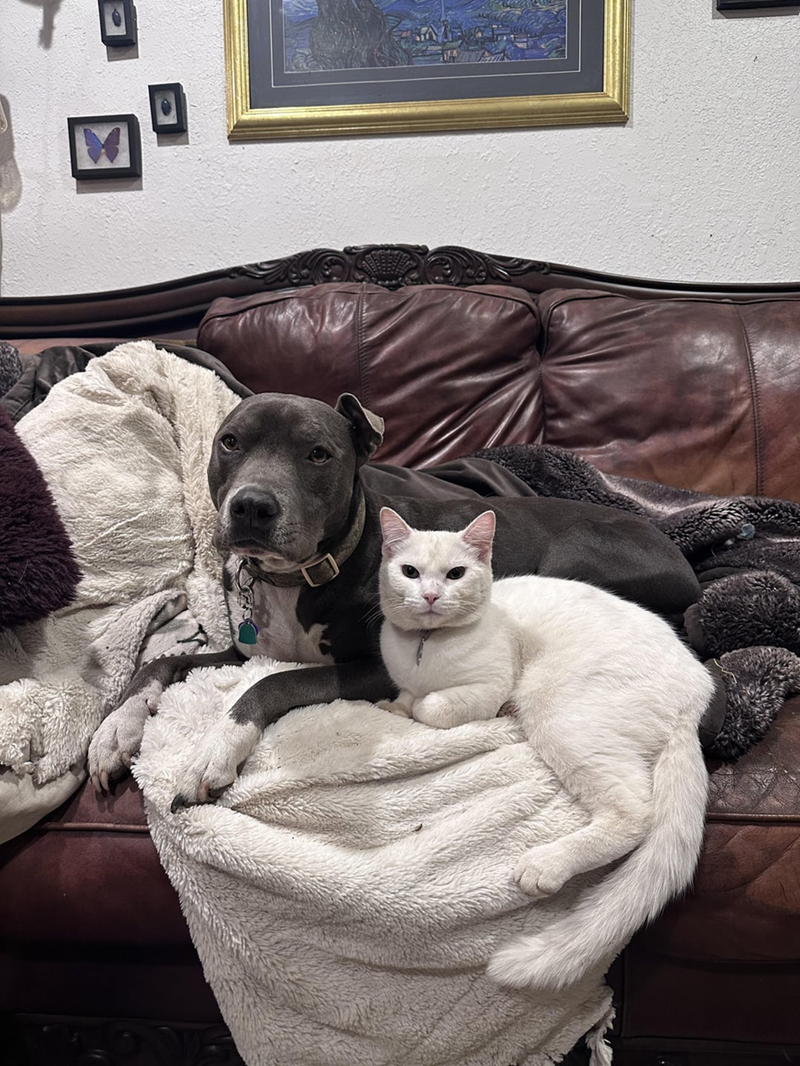 It does not matter which kind of dog and which kind of cat it is as long as they are happy with one another. As long as they vibe. What's more important than anything is them being able to match energies. Maybe she chose the Pitbull because he can give as good as she can. We'll never know.