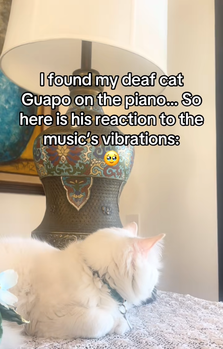 "Found my deaf cat Guapo on the piano… So here is his reaction to the music's vibrations"