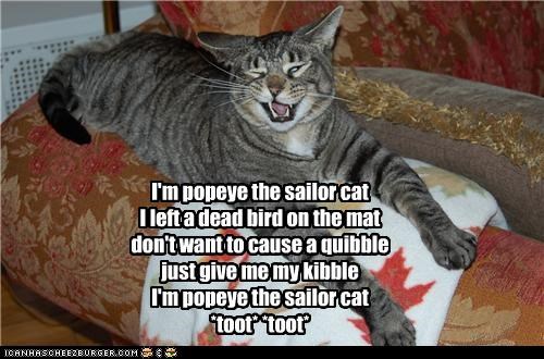 I'm popeye the sailor cat I left a dead bird on the mat don't want to cause a quibble just give me my kibble I'm popeye the sailor cat *toot* *toot*