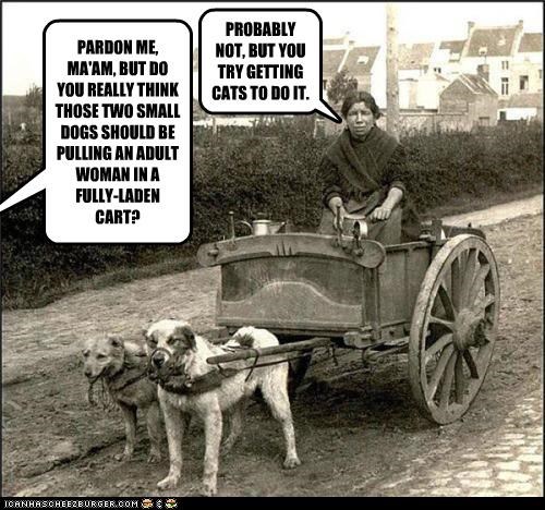 PARDON ME, MA'AM, BUT DO YOU REALLY THINK THOSE TWO SMALL DOGS SHOULD BE PULLING AN ADULT WOMAN IN A FULLY-LADEN CART?