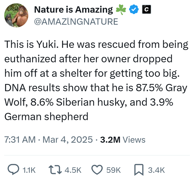 Yuki, the sweet wolfdog that he was, has unfortunately passed away. He was thirteen years old, and he passed peacefully in his sleep. It was a long life, and he was loved not only by his care takers but also by the endless people who have read his story.