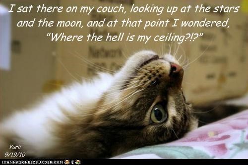 I sat there on my couch, looking up at the stars and the moon, and at that point I wondered, "Where the hell is my ceiling?!?"