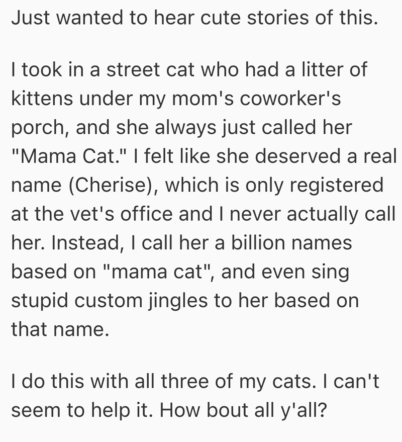 Just wanted to hear cute stories of this. I took in a street cat who had a litter of kittens under my mom's coworker's porch, and she always just called her "Mama Cat." I felt like she deserved a real name (Cherise), which is only registered at the vet's office and I never actually call her. Instead, I call her a billion names based on "mama cat", and even sing stupid custom jingles to her based on that name. I do this with all three of my cats. I can't seem to help it. How bout all y'all?
