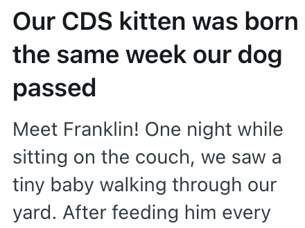 Who could resist this little face? Franklin knew exactly what he was up to when he strolled into their lives. Knowing they had a cat-shaped hole in their hearts, he knew he could step up and fulfill the pawsition of ‘New Pet’ after they lost a beloved pooch. This is the kind of wholesomeness we see all the time from cats. It's as if their predatory-level sensors light up when there's a human in need and they dash into action like they're chasing a laser pointer.