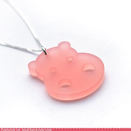 Available from Mariska http://www.etsy.com/listing/54597821/pink-hippo-necklace ($22)