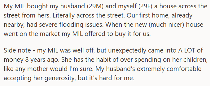 One woman recently found herself having this realization after she and her husband moved into a house that his mom had bought for them. Their old house had received substantial flooding damage, and her mother-in-law put an offer on the new one, across the street from hers, without consulting the couple first.