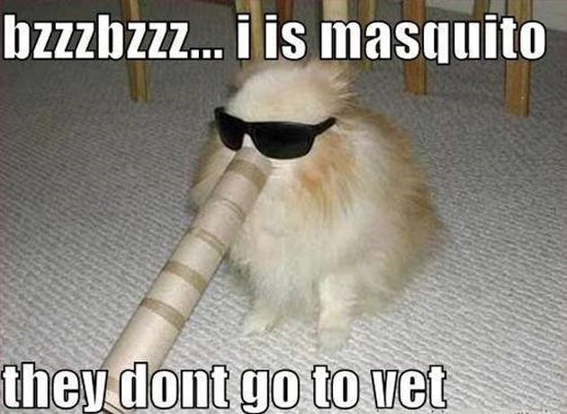 “Woof, uh… Sorry… I mean Bzzzz. I am a mosquito buzzing around the house, and I'm not going to the evil vet because I'm not a dog anymore. What dog? I don't know any dog.”
