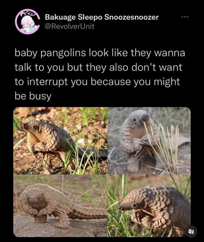 Ohmygosh, did you know that this is how baby pangolins look? Don't worry precious little armored baby, even if we're busy - we're never too busy for you. Talk to us all the time, you pawdorable hedgehog with extra steps.