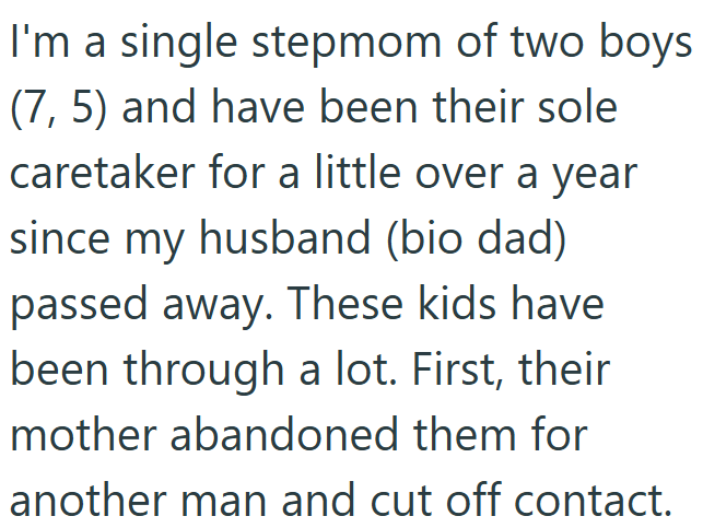 The stepmom in this story was tasked with stepping up as a replacement parent for her stepson's mother and as the sole caretaker of the boys. She has been up a creek without a paddle since her husband passed, and her sister is not helping the situation at all.