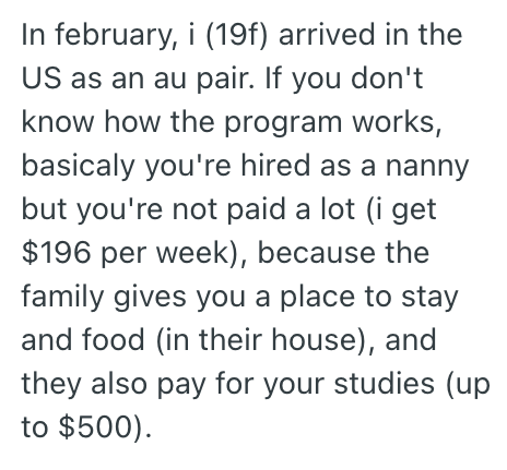 Being an au pair especially presents a precarious situation. Not only are you responsible for other people's kids, but you can't really get away from those issues with the parents since, well, you're living with them. The parents, your “employer,” hold a significant degree of control over your life, being that they're directly providing some of the most important things for security: Food and shelter.