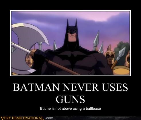 BATMAN NEVER USES GUNS But he is not above using a battleaxe