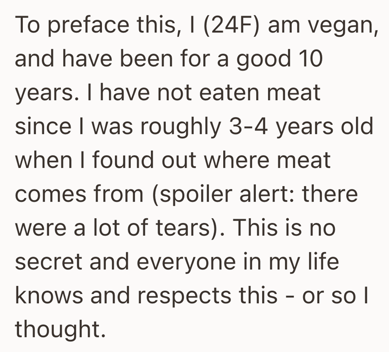 Commenters have all types of reactions to this person's question! Some people think that this person was totally justified in being upset enough to involve the police, while others claim she was taking things way too far. One person pointed out that vegans and vegetarians who've gone long periods of time without eating meat can get super sick when they finally do eat it again. Check out the range of opinions below, and see which side of the disagreement you side with.