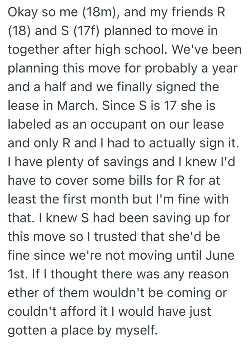18-year-olds' plans to move out of their parents' houses for the first time hit a snag when their third 17-year-old friend declares she's not moving in right away and not paying rent: 'It doesn't make sense to pay for somewhere I don't even live'