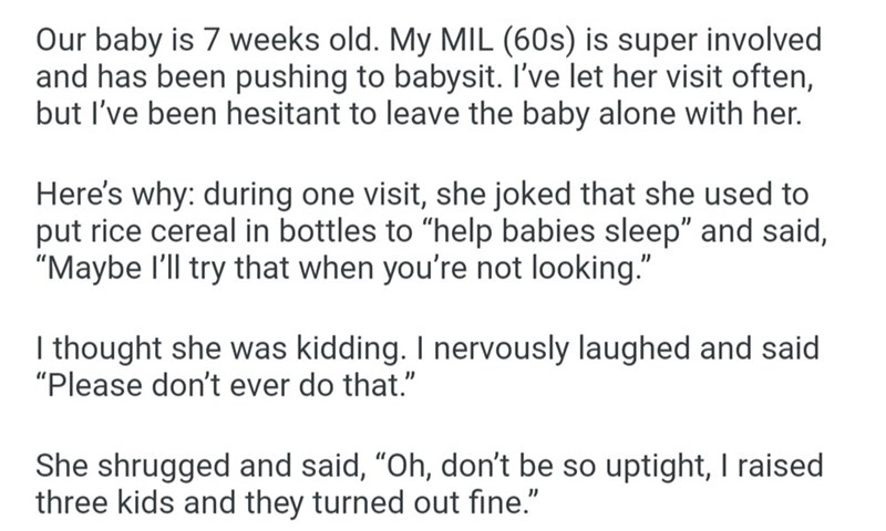 This was an issue that one new mom ran into after her mother-in-law got involved with her and her husband's baby in the weeks after the birth. The grandma made a joke about adding cereal to the baby's bottle so they would sleep better, which concerned her daughter-in-law.
