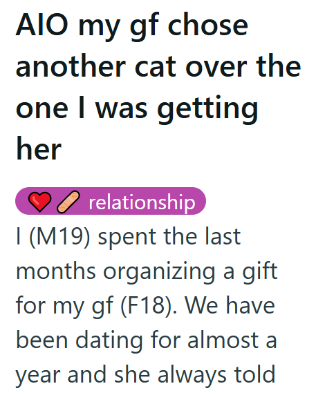 - Cats are still given as gifts, and a gift can be a surprise. But since this kitten was not a surprise to the girlfriend (and even her mother), was the girlfriend in the wrong to “override” the gift she already knew about? Or was she going to fall in love with the different kitten all along, surprise or not?
