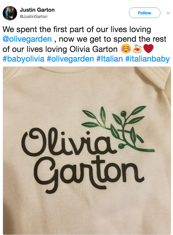 The real question is if Olive Garden's about to give this poor baby free food for the rest of her life? She is the literal definition of a walking advertisement at this point.