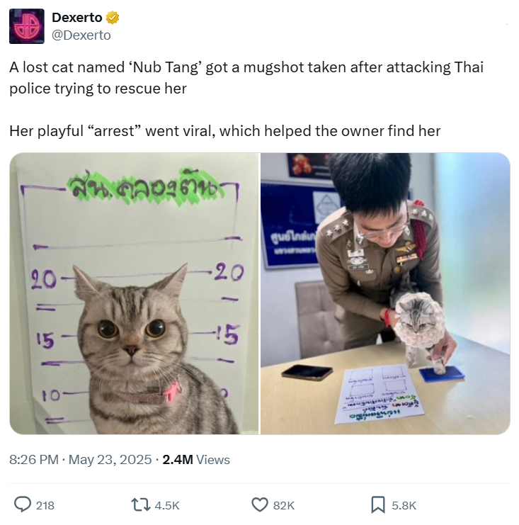 Dexerto @Dexerto A lost cat named 'Nub Tang' got a mugshot taken after attacking Thai police trying to rescue her Her playful "arrest" went viral, which helped the owner find her สน.คลองตันก -20 20- 15 15 10- 8:26 PM. May 23, 2025 2.4M Views 218 14.5K ศูนย์ไกล่เ www 82K 5.8K