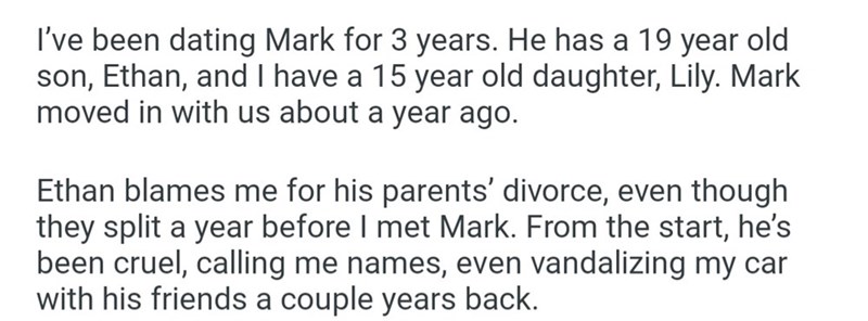 One woman found herself dealing with this after putting her foot down against paying for her partner's son to come on vacation with them. Ever since they had started dating, the 19-year-old had been disrespectful towards her, culminating in him walking out of their home a year ago after he and his partner moved in with her and her teenage daughter.
