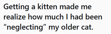 We can definitely understand how a realization on the lines of “My cat was actually not doing good this whole time” can shake a person's confidence in their cat pawrenting. But it seems this particualr pawrent loves their cat so much, and now their kitten as well. And both of the cats love each other. This is what matters.