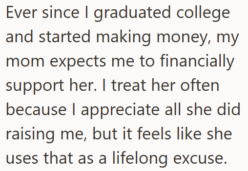 The young woman in this story is struggling to say no to her mom, who thinks she needs to be compensated for the years spent raising her kid. Her mom expects her daughter to fully pay for European vacations for the whole family, just because she financed family vacations when she was a kid.