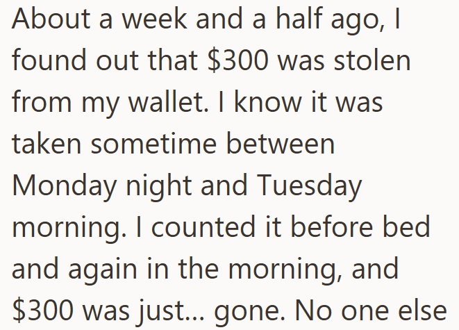 The sister in this story is in a difficult position. She could either take a vacation away from her brother for something he didn't do, or let him get away with stealing $300 without any punishment. She doesn't have any hard evidence that he stole the money, but that's what her gut instinct tells her.