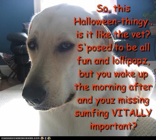 So, this Halloween-thingy.. is it like the vet? S'posed to be all fun and lollipopz, but you wake up the morning after and youz missing sumfing VITALLY important?