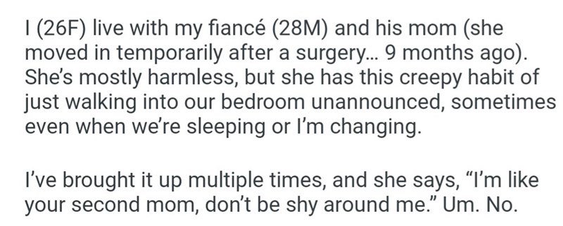 One woman found herself struggling with this after she took steps to prevent her fiancé's mom from constantly walking into their bedroom. She had been staying with them after recovering from surgery and had developed the annoying habit of stopping by their private space on a regular basis.
