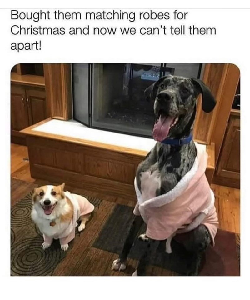 Tell who apart? These twins? We don't know who's who. Two identical doggos with identical sweaters and smiles. Is this some trick question to try and tell them apart?