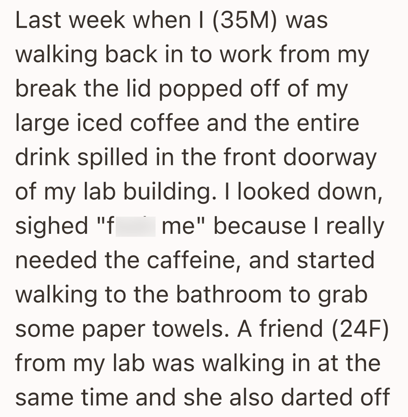 'Did you want me plop down and sit on it?': 24-year-old drops iced coffee at work, busybody 55-year-old coworker tells her to clean it up as she's already running to get paper towels, she snaps back