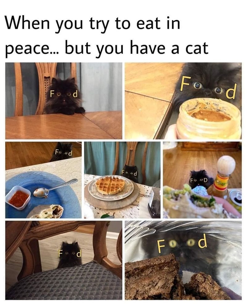 This is every cat, in every house, despite the actual level of food inside said house. There will never be “anything to eat around here”, and the bowl will always be “half empty, which is practically empty".
