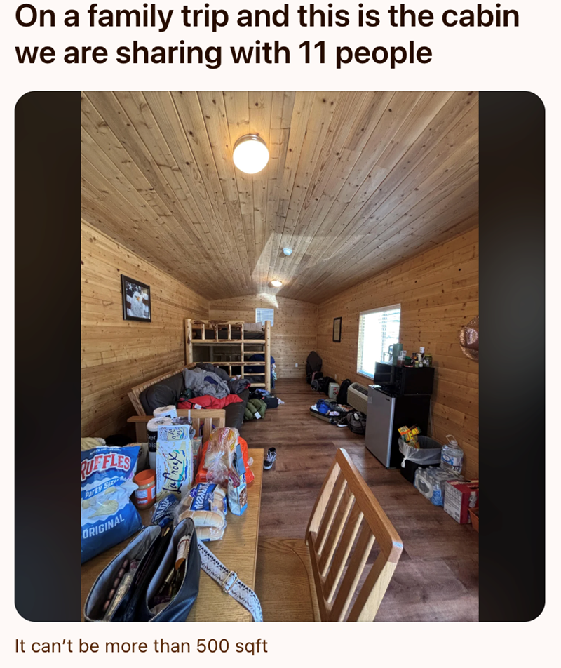 "10 of us are adults, one of us is a child," this person wrote in an update. Apparently, their mom booked a cabin that purportedly "slept 8," but uh… that looks like it sleeps 2 people in that bunk bed, 1 or 2 on the couch, and the rest on the floor, Tetris-style. They also still seem to be having a good time, noting that they have been laughing and cherishing the time together.