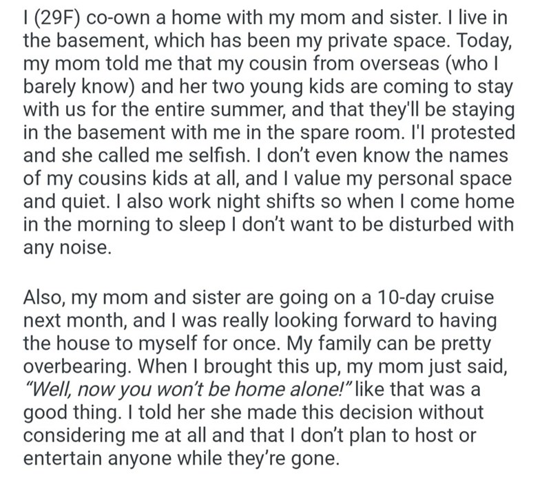 29-year-old home co-owner protests and plans hotel stay when mom insists on letting cousin and 2 kids stay in her space for the summer: 'Now you won't be home alone!'