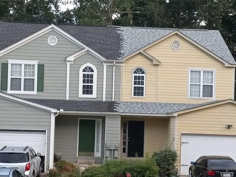 You can only imagine that this was a DIY project gone awry. Something like the neighbor in the cream-colored house seeing their neighbor redoing their shingles. And without thinking they ask their neighbor to do some of theirs as well while they are up there. It looks like these two houses were torn apart from their correct halves and stitched together instead.