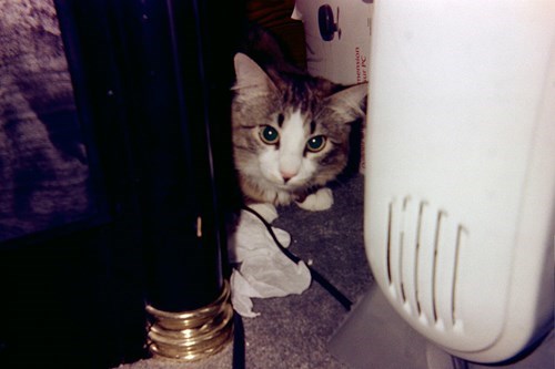 Miracle has few classic quirks. He's a very finicky eater, much more so than Morris ever thought about being. He likes dry cat food, and some wet food. He LOVES grass, and begs us to go outside and get him some, which we do. He likes green food drinks and one time he lapped up some wheatgrass like it was nobody's business! Maybe he's borderline vegetarian? Aifinkso! Oh!... And he hates baffs! -