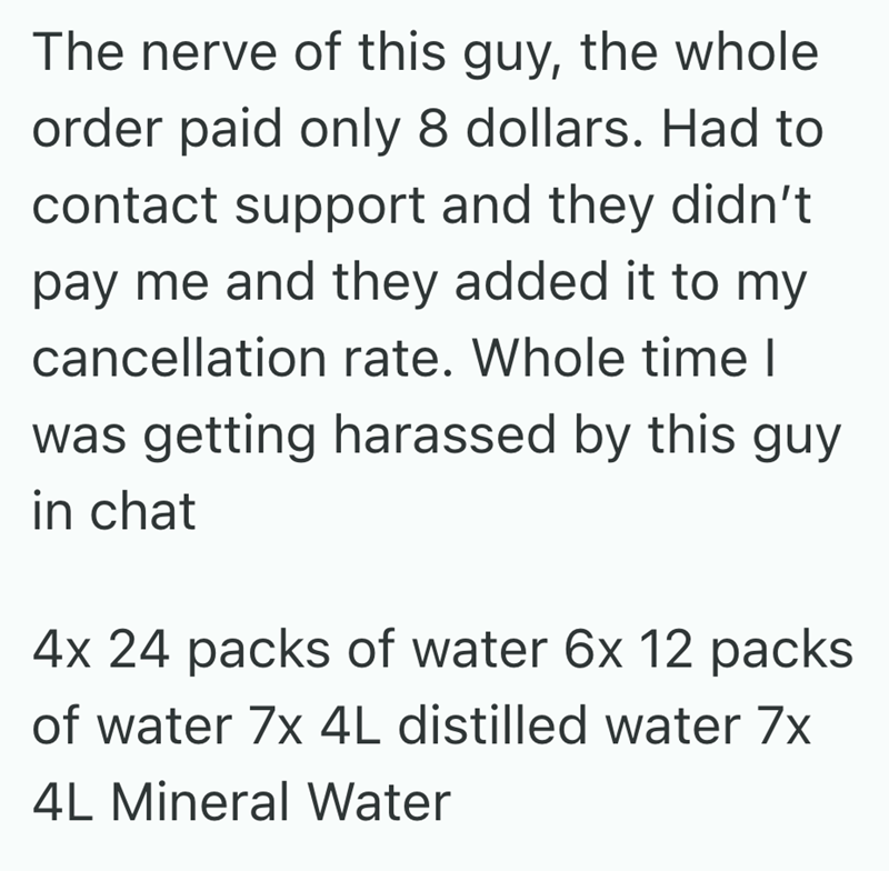 I feel this delivery person's pain, and I hope they got a few better orders after this dude. And that person stuck in their 17th-floor apartment with no water or elevator access should call 311 and get their water turned back on ASAP… and then invest in a Brita filter instead of 158739450142739 water bottles.
