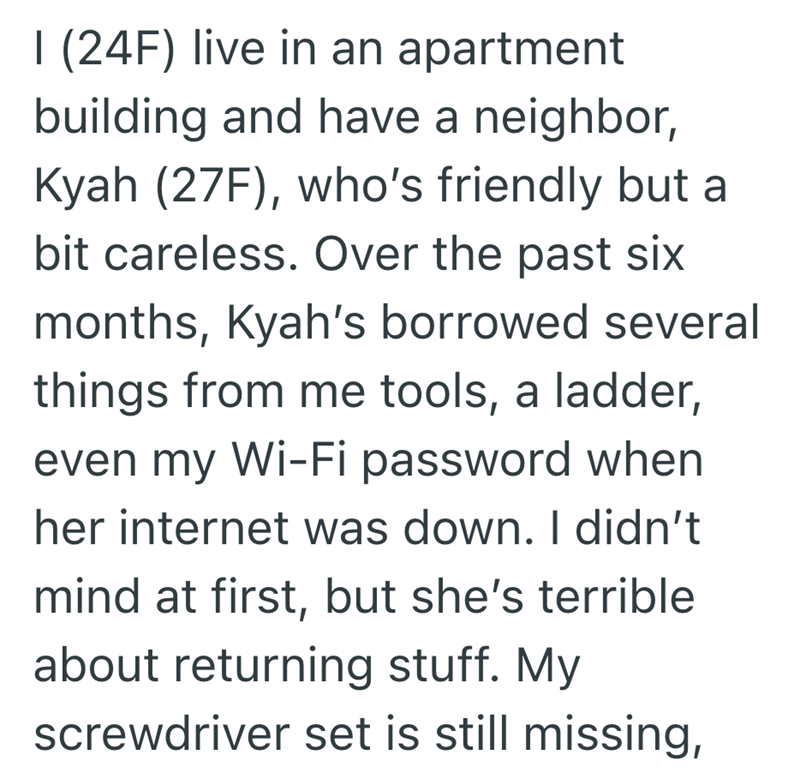 I (24F) live in an apartment building and have a neighbor, Kyah (27F), who's friendly but a bit careless. Over the past six months, Kyah's borrowed several things from me tools, a ladder, even my Wi-Fi password when her internet was down. I didn't mind at first, but she's terrible about returning stuff. My screwdriver set is still missing,