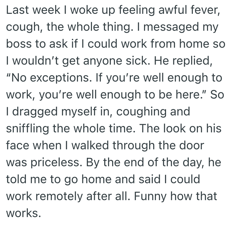 "Boss said no working from home, so I came in sick as requested."