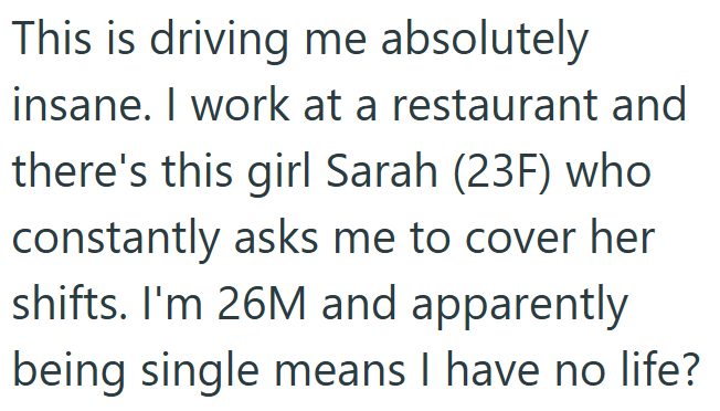 23-year-old forces her coworker to constantly cover her shifts because she has a boyfriend and he's single: 'I figured you'd be fine with it since you don't have a girlfriend or kids to worry about.'
