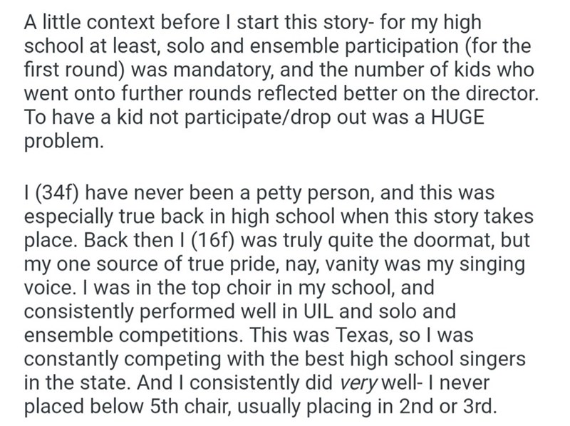 This embarrassment led her to seek revenge on her cruel choir director. The year after, her voice was in good enough shape for her to enact her plan. She recounted the story.
