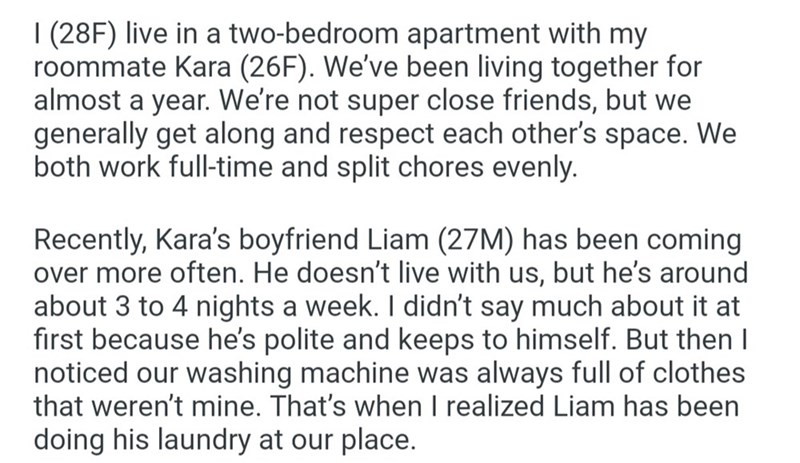 For one woman, her roommate's boyfriend was clearly overstepping these boundaries with his habit of doing laundry at their apartment. Although he didn't live there, he visited several times a week and almost every time overtook the washer and dryer for hours.