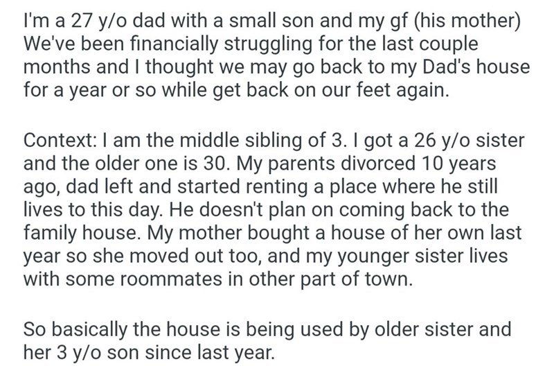 Mom lives in father's home with 3-year-old son, protests when younger brother proposes him, his girlfriend and child move in: 'I thought I could go back'