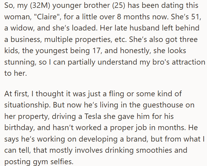 When his younger brother got into a relationship with a much older woman who had been widowed, he had some concerns. The woman had spent lavishly on her new partner, including paying off his student loans and buying him a Tesla.