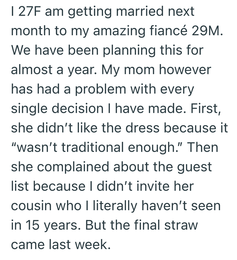 That's what happened in this story, where a mom was impossible to please and made her daughter pay the price. After trying to bend to her wishes on her big day, she finally drew the line, but was left wondering what that meant for their relationship.