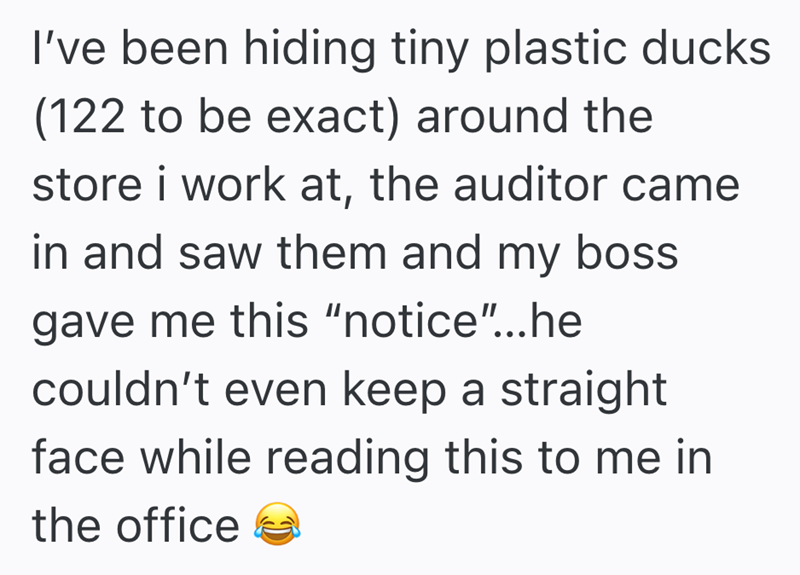 "A 'notice' from my boss after hiding tiny ducks around the store"