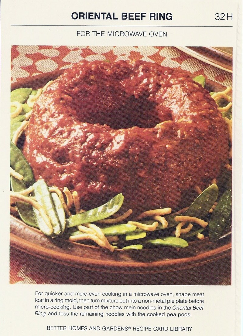 ORIENTAL BEEF RING 32 H FOR THE MICROWAVE OVEN For quicker and more-even cooking in a microwave oven, shape meat loaf in a ring mold, then turn mixture out into a non-metal pie plate before micro-cooking. Use part of the chow mein noodles in the Oriental Beef Ring and toss the remaining noodles with the cooked pea pods. BETTER HOMES AND GARDENS® RECIPE CARD LIBRARY