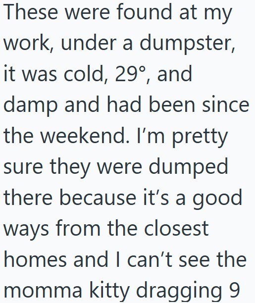While it might be weird to say, we do have to thank the person who dumped these poor cattos for placing them under a dumpster that was not used for food or medical waste. That would have truly put this feline family in grave danger of contracting all kinds of infections and illnesses.