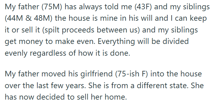 Dad moves 75-year-old girlfriend into house kids are due to inherit, 43-year-old daughter plans to remove her after his passing: 'He laid down a huge guilt trip'