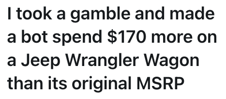 Conning a conman is the only way to gain their respect, but in a world that's constantly inundated with bots and “clunkers” at every turn, it feels good to stick it to the man hiding behind the curtain of 10,000 binary codes. Because in the dishonest world of online auctions, tugging at the thread that leads to an actual person is tougher than it sounds. However, the guy in this next story was able to shine a blinding spotlight on a dude's poorly designed bot operation, forcing him to pay $170 over MSRP for a kid's toy car as petty revenge.